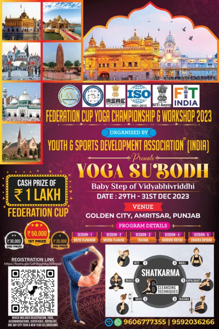 Youth & Sports Development Association (India) is immensely pleased to launch a program of Sports, Education and Skill Development “Vidyabhivriddhi”. Under this program, YSDA is taking baby steps and is excited to host a workshop on Yoga -Yoga Subodh (Meet the True Self) along with the Federation Cup Yoga Championship 2023 from 29th to 31st December 2023 at The Golden City Amritsar (PB). Apropos to this we request the honour of your presence. We would be glad if you grace the program with your enthusiastic participation as it will surely help you to meet your true self and enhance the skills. The schedule of the program is enclosed herewith. Note: Last date of registration will be 5th December 2023. No registrations will be considered after this date. This is for a strict compliance.